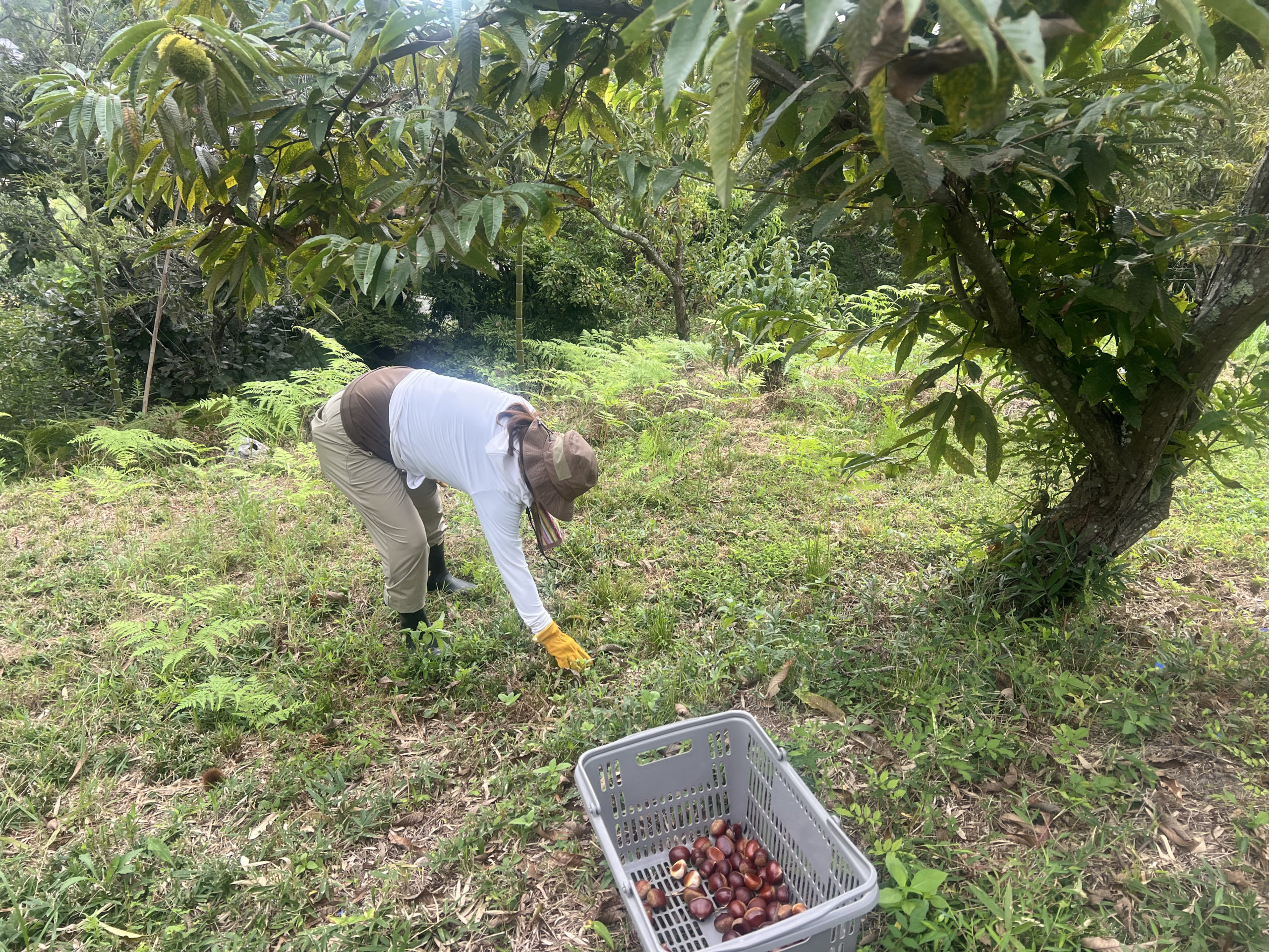 栗の木の下に目をこらすと、あちこちに落ちている。 みんながそれぞれのペースで、黙々と、でも楽しそうに拾い続けます。 かごに栗がたまっていくたびに、なんだかじんわりうれしくなってくる。